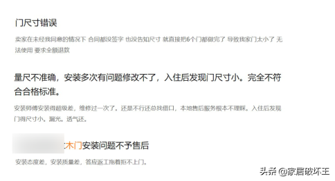 在黑貓投訴中,對(duì)于木門(mén)的投訴多集中在裝載耽擱、丈量有誤和售后問(wèn)題不解決這幾方面。