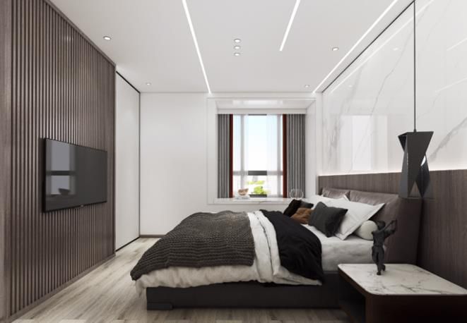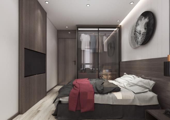 次臥搭配金屬吊燈,玻璃推拉衣柜,電視則是嵌在木飾背景上,加上吊頂的點光源,將次臥的空間氛圍烘托的更加溫馨愜意。