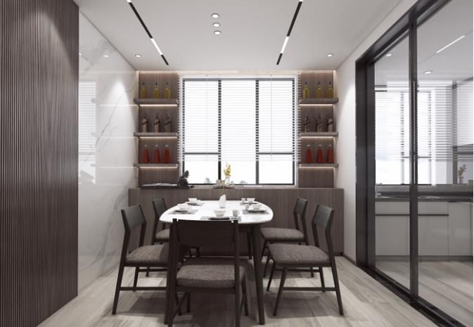 儲物餐邊柜,木飾面加大規格巖板背景,實現裝修內容主次分明,有詳有簡。