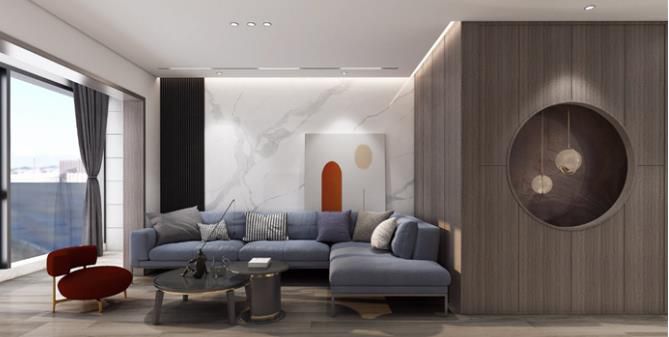 客廳吊頂只簡單做了一個平頂直線造型,突顯簡潔流暢的設計風格。