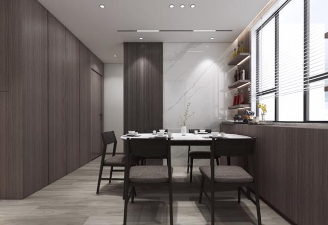 餐廳地面延用了木紋磚,大平吊頂加上軌道線性燈,中間黑白相間的大理石餐桌