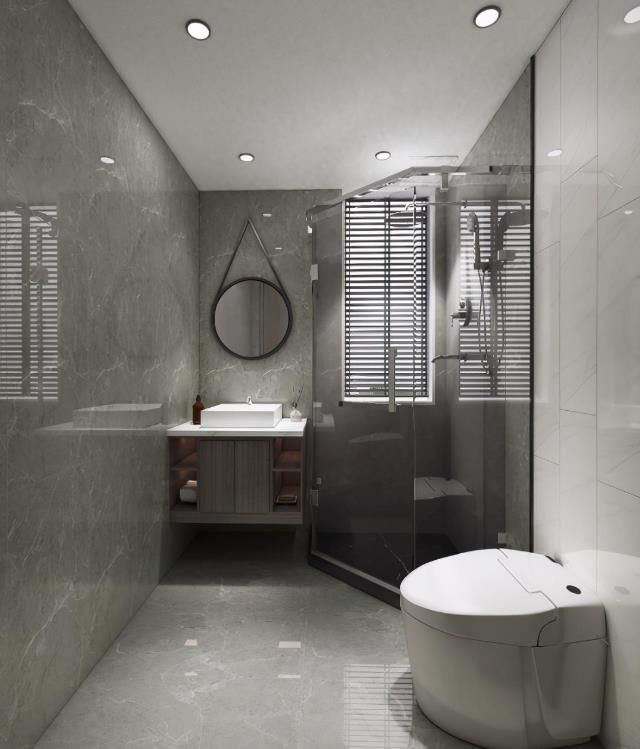 主衛選用灰色全拋釉瓷磚進行大面積鋪貼,小面積用白色瓷磚切割作為背景,起到整個空間的點睛之筆。