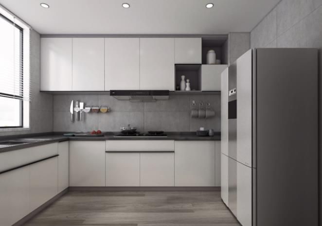 廚房空間狹長,廚柜白色面板與灰色柜體結合,雖然形式看似簡單,但每個抽屜內部是不盡相同的使用各種內置式抽屜和金屬拉籃,給主人提供了方便的操作空間。