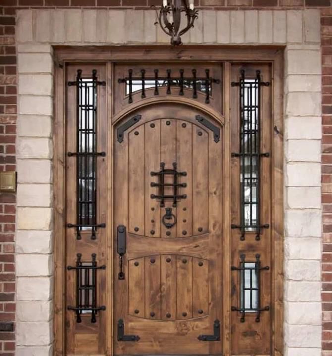 一種流行的前門材料組合是木材和鍛鐵。熨斗增加了裝飾元素,在某些情況下還增加了安全性。查看上面定制的仿古木和鍛鐵前門,這是使用這兩種材料的一個很好的例子。
