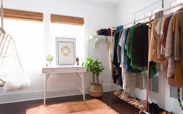 一間同樣沒有衣柜的房間。雖然她的儲物空間很大,但對于一個時尚博主來說還是不夠用。所以,女孩沒有買衣柜,而是把一間備用臥室變成了一個大衣柜。雖然不是每個人都有像海莉這樣的衣服專用的房間,但這對時尚達(dá)人來說也是一個有用的教訓(xùn):盡可能定制。