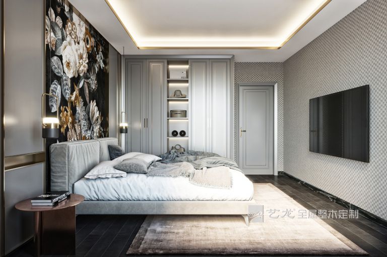 臥室的整個墻面是淺灰色,床品、軟裝也是灰白色的,搭配淺灰色的衣柜、床頭柜等家具,整個臥室看起來非常輕松和舒服。